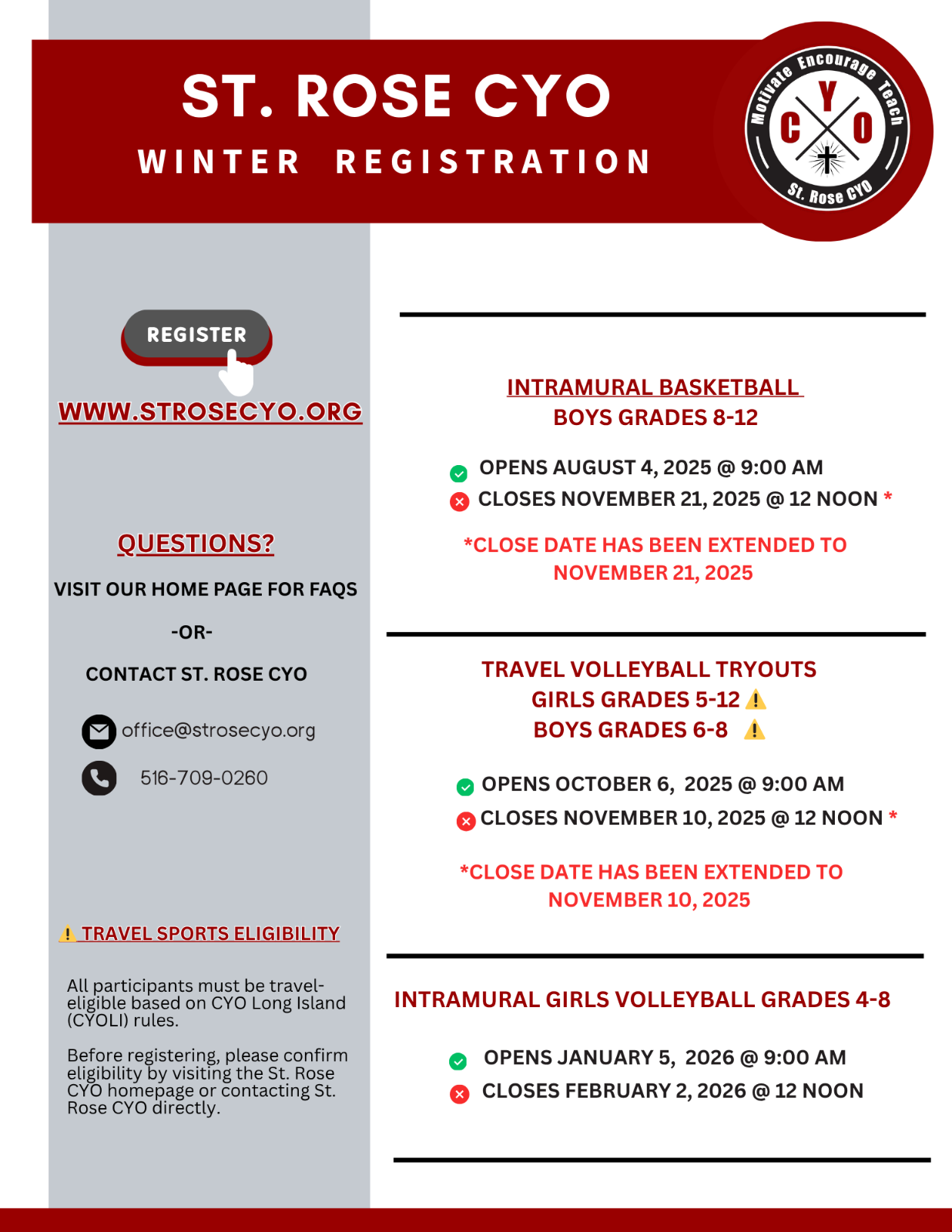 Due to limited capacity, Intramural Volleyball is available to Massapequa Residents (11758/11762) and St Rose of Lima students only.